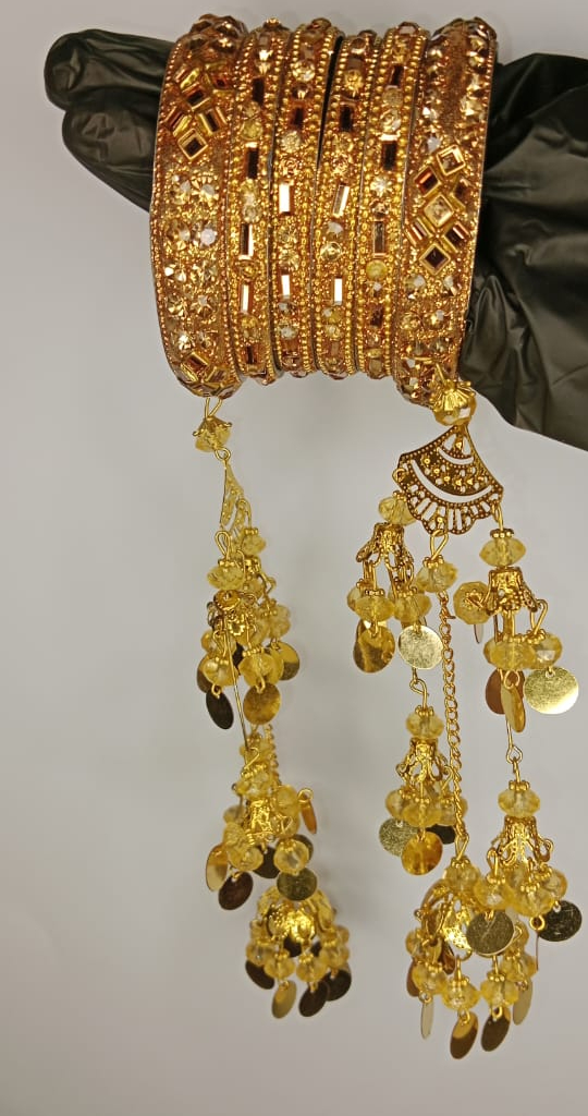 Luxurious Bridal Golden Bangles Set With Intricate Stonework And Traditional Hanging Kaleere For Weddings And Special Occasions 2.5inch (without Box)