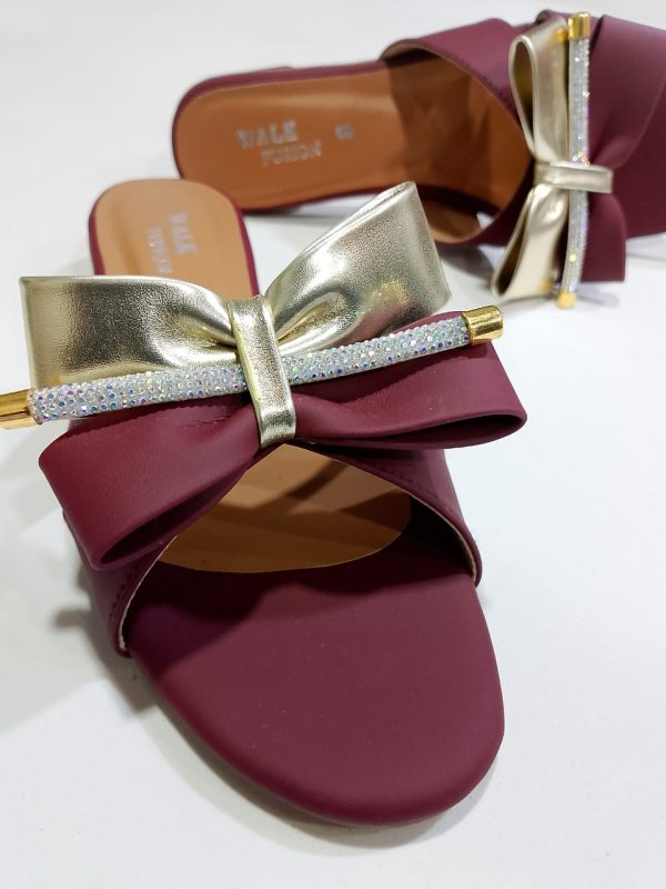 Step into effortless elegance with these stylish maroon slip-on slippers, designed with a comfortable block heel perfect for daily wear or special occasions. Featuring a luxurious gold metallic bow accented with sparkling rhinestone detailing, these slippers add a touch of glamour to any outfit while ensuring a secure, easy fit.